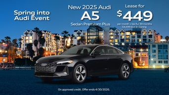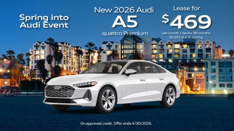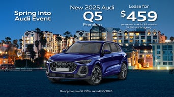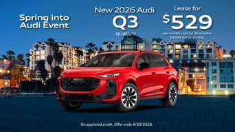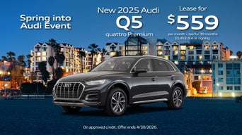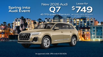 *Closed-end lease financing available through 04/30/2026 for a new, unused 2026 Audi Q7 45 TFSI quattro Premium on approved credit to highly qualified customers by Audi Financial Services through participating dealerships. 1 available at this offer. Example: VIN: WA1ACBF7XTD007069. Lease offer only eligible to customers residing in CA. Monthly lease payment based on MSRP of $67,355 and destination charges, less a suggested dealer contribution of $2,856, and application of $5,000 lease bonus resulting in a capitalized cost of $67,355. Dealer’s contribution may vary and your payment will differ based on final negotiated price. Lease bonus not redeemable for cash. Plus government fees and taxes, any finance charges, $85 dealer document processing charge, any electronic filing charge and any emission testing charge. $0 security deposit required. Amount due at signing includes first month’s payment plus tax,customer down payment of $5,499 and acquisition fee of $895. Monthly payments total $26,964. At lease end, lessee is responsible for disposition fee of $495, $0.25/mile in excess of 30,000 miles and excessive wear and use. A $395 fee applies if you purchase your lease vehicle. Offer not valid in Puerto Rico. See your local Audi dealer for details or, for general product information, call 1-800-FOR-AUDI. © 2026 Audi of America, Inc.